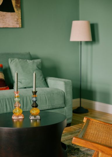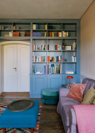 Heute beherbergt das Anwesen insgesamt vier Ferienwohnungen, die wir alle für das Wochenende exklusiv für uns gemietet haben. Sie vereinen historische Elemente und ausgewählte Vintage-Möbel mit viel Gemütlichkeit und moderner Kunst. Im Erdgeschoss befinden sich neben einer gut ausgestatteten Küche, einem Ess- und einem Wohnzimmer noch eine Bibliothek, ein Kaminzimmer sowie ein größerer Raum für unser Retreat. Es gibt auf dem Anwesen außerdem eine Sauna.